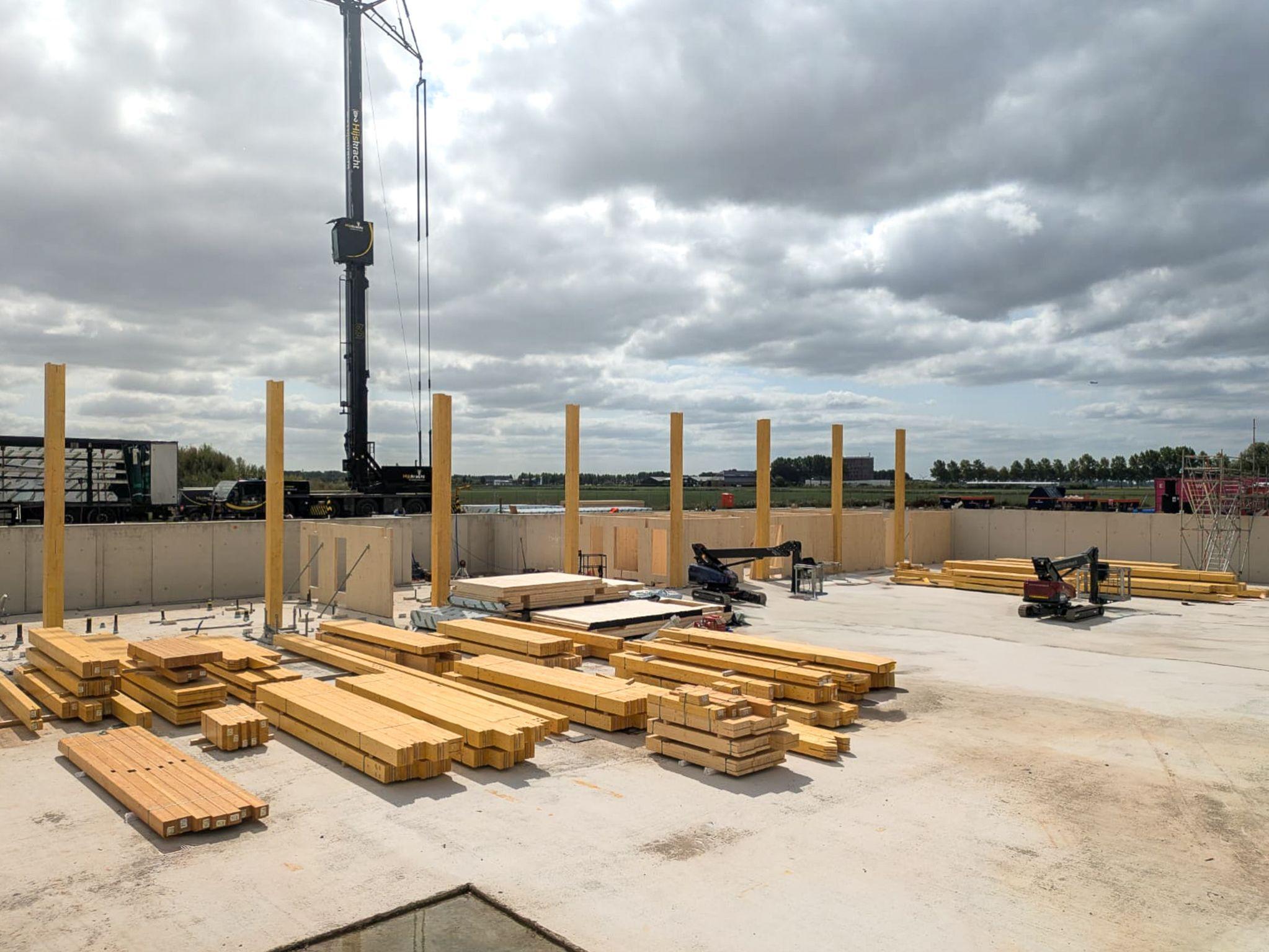 De betonnen wanden van de kelderbak zijn geplaatst en de grond rondom aangevuld. Daarmee ligt de sporthal nu verdiept in de grond. Momenteel werken we aan de houtbouw, wat een groot onderdeel van de hoofddraagconstructie is. De komende weken zullen wij hier samen met de onderaannemer StructureWood (WoodLam) verder aan bouwen. Zo krijgt de sporthal steeds meer vorm.