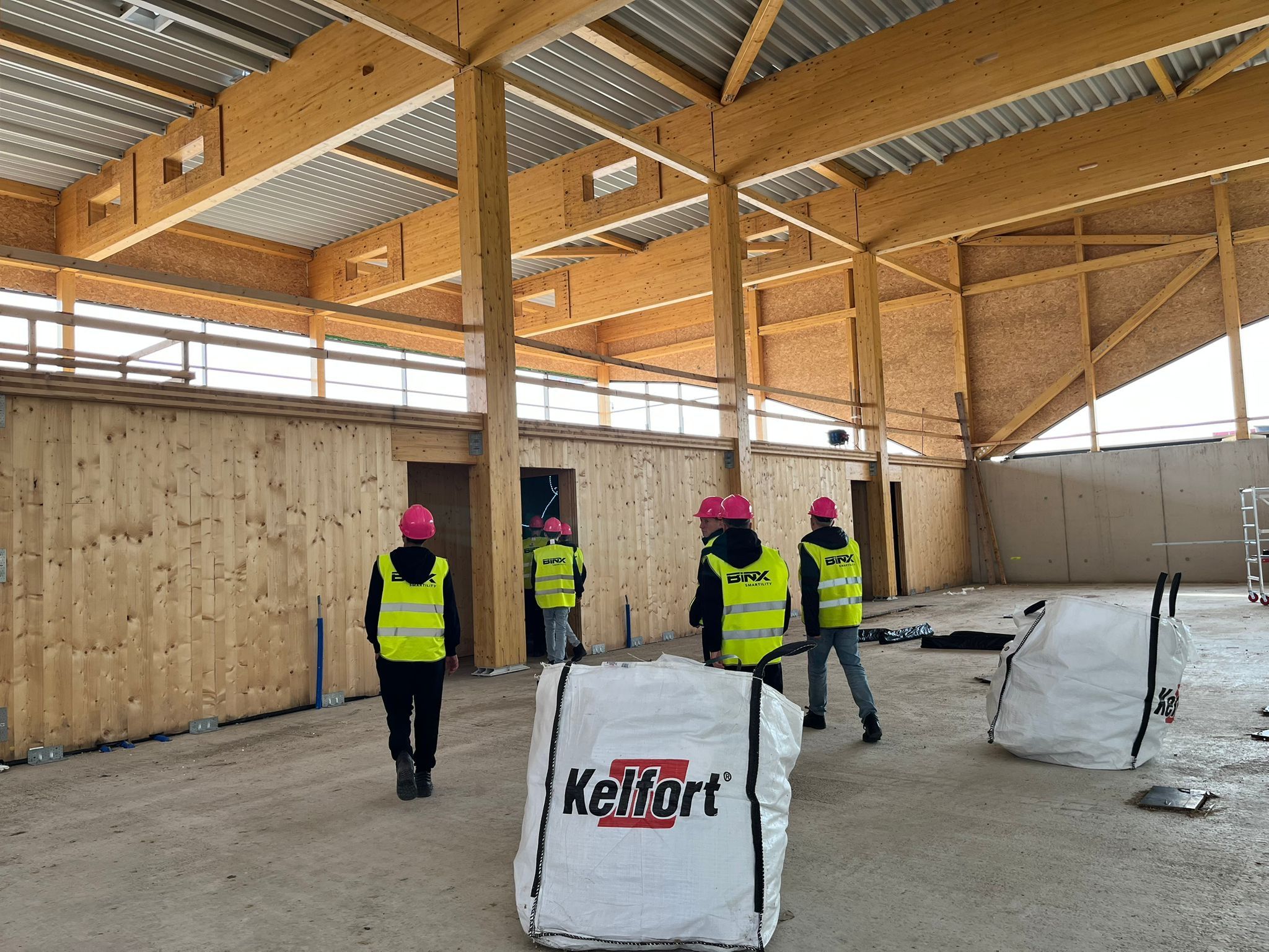 Tijdens de rondleiding kregen ze uitleg over de verschillende houten constructies in het gebouw, de voortgang van het project en wat er allemaal komt kijken bij het realiseren van zo’n sportaccommodatie.