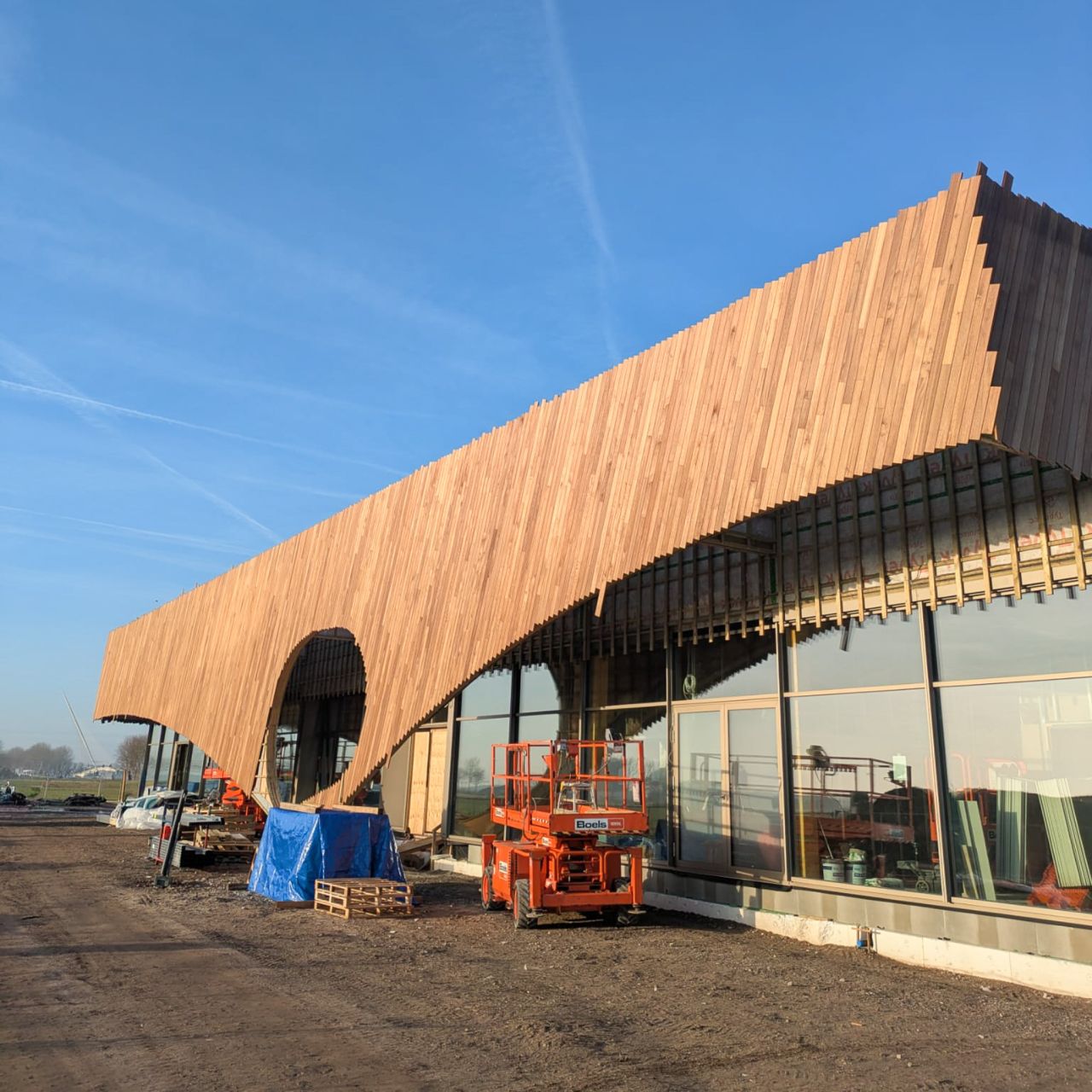 Zo hebben we de eerste hand gelegd aan het bekleden van de gevel. Hiervoor is gekozen voor basralocus, een duurzame hardhoutsoort die zorgt voor een warme, natuurlijke uitstraling. Daarmee zetten we een mooie stap richting de realisatie van een echte blikvanger voor de wijk!
